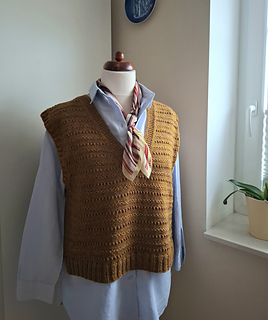 The vest is knitted top down, seamlessly. The back neck is knitted first and shaped with short rows. Top of the back is knitted flat until underarms then stitches are put in hold. Stitches for the left front are picked up and knitted until underarm in the same time as the left V-neck border. Then the right front is worked the same way. The bottom of the body is knitted in the round. At then stitches for armholes are knitted in garter stitch, in the round.