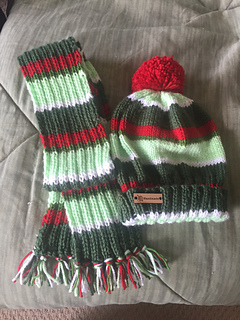 Gauge: 18 sts = 4” over st st using size US 8 needles for hat. 20 sts = 4” over st st using size 7 needles for mittens. 16 sts =4” over st st for scarf.