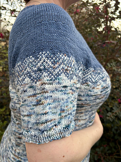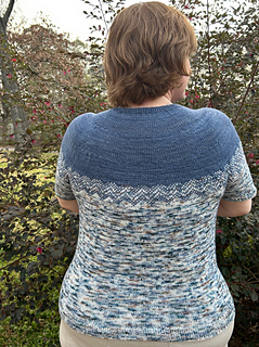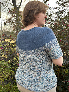 This top-down, round neck pullover features a simple geometric pattern that even an absolute beginner to colorwork will be able to make. This is shown with short sleeves, but instructions are included for any sleeve length.
