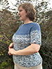 Yarn: The Whimsical Ewe Delightful Sock (75% Superwash Merino wool/25% Nylon, 437 yards/100g), 2(2, 3, 3, 3, 4) skeins main color as shown, 1 skein of contrast. Long sleeves may require more of the main color. Sample worked in Faded Glory (contrast, at top) and Snowbird. 44” bust, 16” body sample took 80g contrast color and 185g main color. As with any indie yarn, alternate skeins throughout.