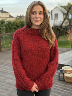 Fagerholt sweater with raglan, cables on the rib edgings and sleeves, worked in Plassard Neptune. The sweater is knitted from the bottom up, and the sample in the photo is size M. The pattern is available in 8 sizes.