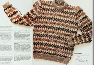 “A modern interpretation of a classic sweater type which is popular with both sexes. The use of a multi-color yarn simplifies the design scheme and so makes the sweater easier to knit up than the traditional Fair-Isles.”