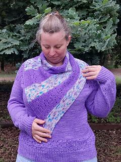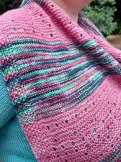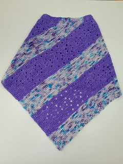 The pattern uses 50 (75) g yarn in a variegated colour for the garter sections and 50 (60) g in a semisolid colour for the lace sections.