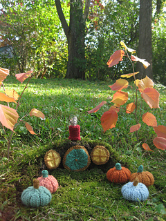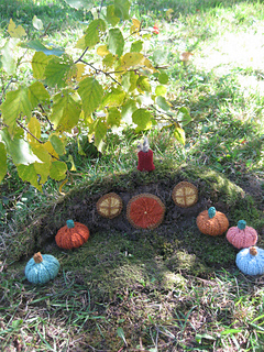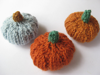 These pumpkins are a fun, quick knit. They are knit in the round on dpns from the bottom to the top. The cast off end is used to help shape the pumpkin and to get it to lay flat. The cast on end is used to close up bottom end.