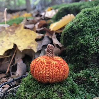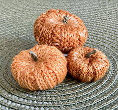 These pumpkins are a fun, quick knit. They are knit in the round on dpns from the bottom to the top. The cast off end is used to shape the pumpkin and to help it lay flat. I used worsted, but they look great in sock or fingering too.