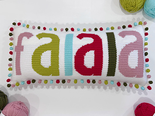 This pattern is worked in worsted weight yarn. The pillow can be made one-sided by making the back panel in plain white, or it can be made reversible by making a second FALALA panel or, alternatively, by using my companion MERRY pattern.