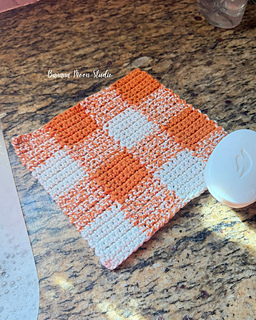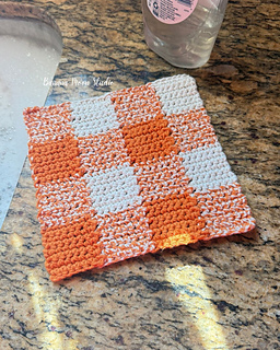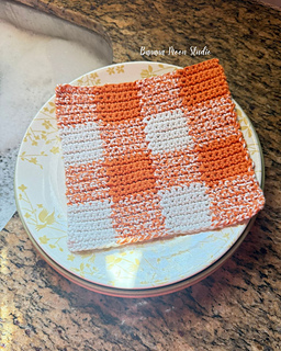 This cute gingham dishcloth is going to be so cute as part of your fall decor this year! I also have matching designs for a kitchen towel, a hot pad, and a placemat. They will all be available soon on my website as free, ad-supported patterns.