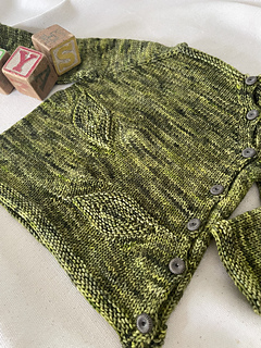 Falling Leaves is a cute little unisex knitted baby cardigan featuring angled, textured leaves that appear to drift down the front. The knitting pattern is suitable for a single skein of hand-dyed variegated sock yarn.
