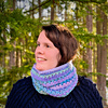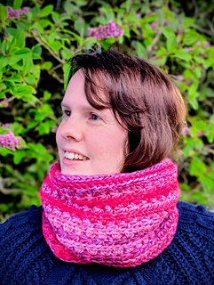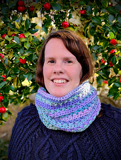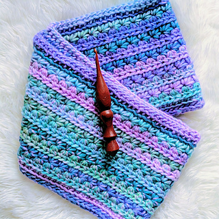 This scarf features the beautiful star stitch. The infinity scarf is quite stretchy and one size should fit over a range of head circumferences. It is designed to be looped twice over the head, with a bit of negative ease over the head for a snug fit at the neck.