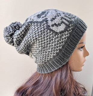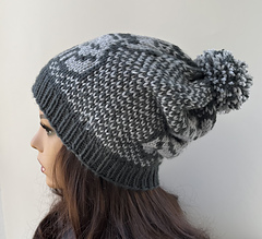 This Power Armour toque is knit in stranded colour work with two contrasting colours of worsted weight yarn. It is sized to fit the average adult, with a relaxed, slouchy fit.