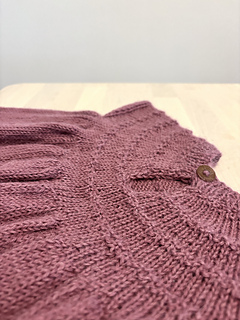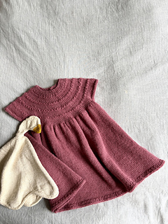 This dress is worked top down with a round yoke, first knit flat to create the buttonhole and the opening at the back, and then joined in the round before the body and sleeves are separated. The seed stitch patterning is worked with just knit and purl stitches to create a fun and easy texture. The rapid increase round for the skirt creates a flowy and graceful fabric, and can be knit to your desired length before completing the dress with an I-cord bind-off. The sleeves will be picked up last, with short sleeve or bracelet length options, and once again finished with an I-cord bind off.