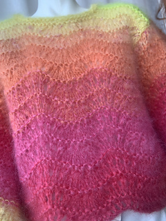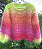 Mønsteret på denne genseren er perfekt til å bruke opp rester av mohairgarn! Du strikker med dobbel tråd, og velger om du vil ha 2 tråder i samme farge, eller blande dine egne med 1 tråd av 2 forskjellige farger. Oppskriften forteller deg ca. hvor mange meter eller gram du trenger for hver bølge/stripe i mønsteret. Eller strikk den lik som på bildet :-)