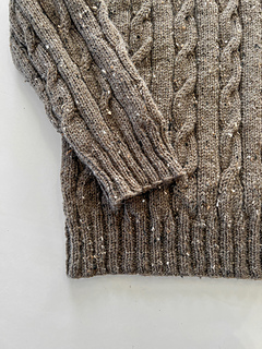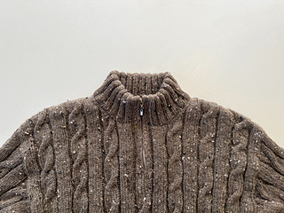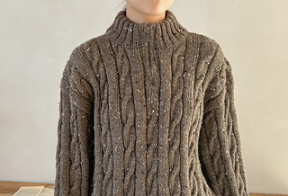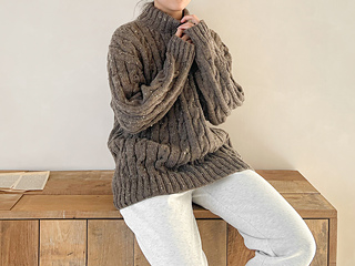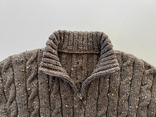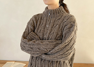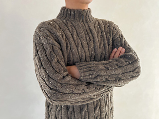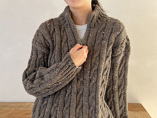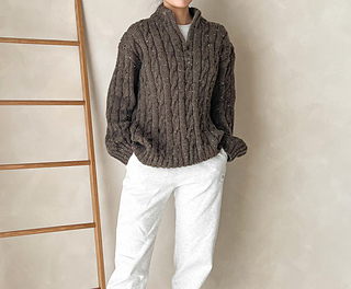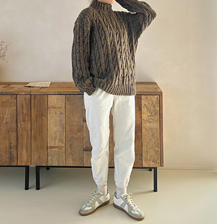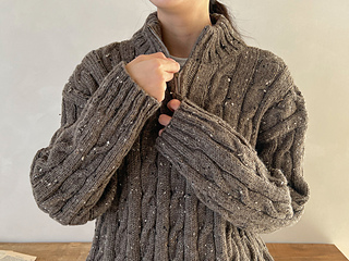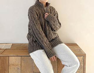 This is a simple cable half-zip sweater worked top-down. The back begins with slight shoulder shaping, then the front is knitted in two separate pieces to form the zipper opening. After that, the front and back are joined and the body is worked in the round. The sleeves are picked up and knitted in the round, and the neck collar is worked by picking up stitches, knitting it long, folding it in half, and sewing it down on the inside. The fit is a relaxed oversize; for reference, the XL size fits men’s 100–105 KR size well. A detailed written pattern and zipper-installation video tutorial are included.