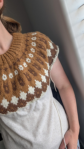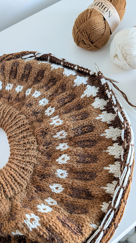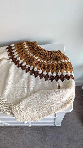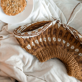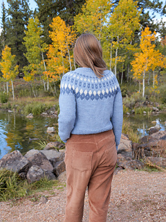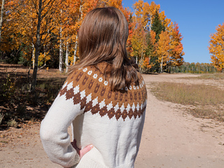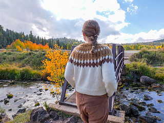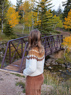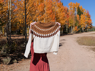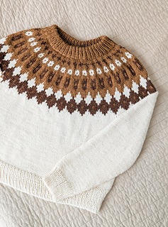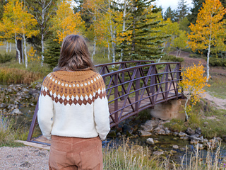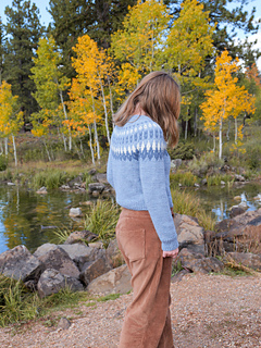 The Faye Sweater is a DK weight seamless top down sweater featuring a three-color colorwork design on the yoke. It is worked in the round from the top down, starting with optional short row shaping. After the colorwork section is complete, stitches are put on hold for the sleeves, and the body is knit to the hem in the round. Stitches are picked up and placed back on the needles, to be knit down and in the round for both sleeves.