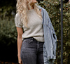 The Faye Tee is a raglan style sweater tee knit on circular needles from the top down. The sleeves are picked up and completed after the body of the sweater is finished.