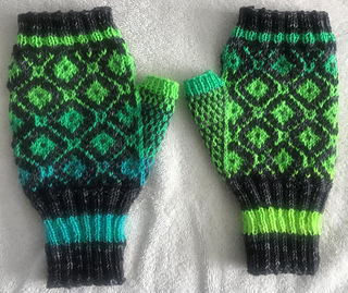 I have included photos of the yarn I used in the black / green / blue mitts. The yarn was purchased in Spring 2018.