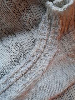 A sock, feather-light, knitted with two threads, one kidsilk/mohair and one thread fingering yarn. An adorable pattern that follows the sock up or down.