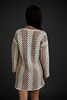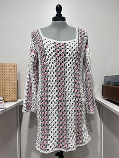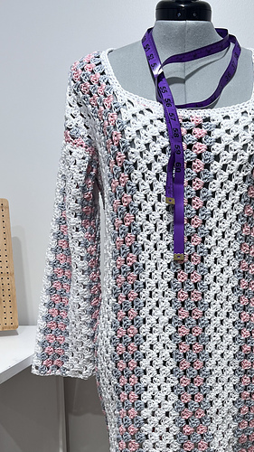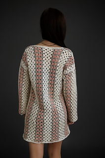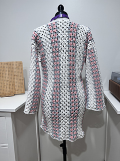 - The dress is constructed from front, back, and sleeve panels, with rows running vertically on the finished garment.