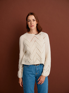 This lace sweater is worked top-down, with a longer raglan yoke for a classic, comfortable fit. After the 1 x 1 Rib collar, short rows and raglan increases are worked, and the simple lace pattern is established at the start of the raglan shaping. The body and sleeves are knitted in the round, and finished with 1 x 1 Rib. The body’s lace pattern is echoed on the sleeves, just before the cuffs.