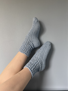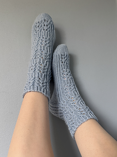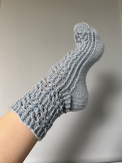 The pattern features a rhythmic lace motif, a reinforced heel flap, and wide band toe decreases for a comfortable and well-fitting finish.