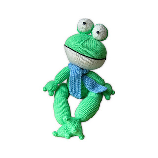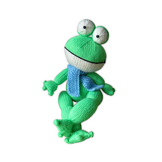 Felix is a happy frog with a big smile! This frog is worked mostly in stockinette with decreases and increases for shaping, and knitted bobbles for toes. Designed by Amanda Berry @fluffandfuzz, the frog is knitted in acrylic DK yarns on single pointed needles (not in the round).