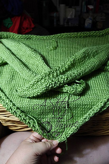 This shawl was created while I was knitting a completely different project. While this idea was still milling around in my head, I had picked up a few skeins in medium and light weight yarn to experiment with. The Bernat Satin in Fern green is what I started out with and am quite pleased with it. Because of the size of the needles and the slipperiness of the yarn, I’d suggest using bamboo or wood circular needles to help prevent slippage. This pattern starts at the top of the shawl and you can create tassels or knot the two ends loosely, or simply leave it as it is. I’d definitely recommend blocking this item.
