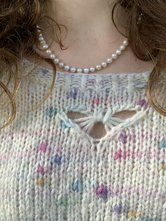 Genseren strikkes nedenfra og opp med raglanfelling. Løkkekanten nederst på ermene strikkes frem og tilbake, og etter løkkene strikkes ermene rundt.