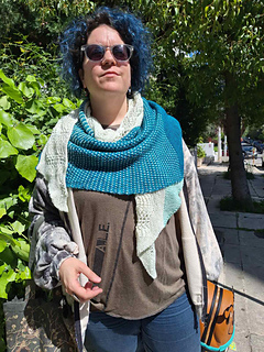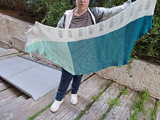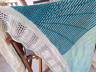 Finished measurements: 188 cm wingspan, 62 cm width. Measurements taken after blocking.