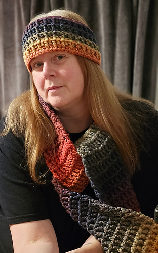 You can find the matching scarf at this link: https://www.ravelry.com/patterns/library/fiesta-sunset-scarf