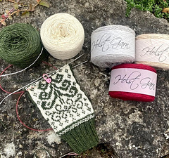 Garn: Holst Supersoft 50g Ett nystan av varje färg behövs till ett par vantar.