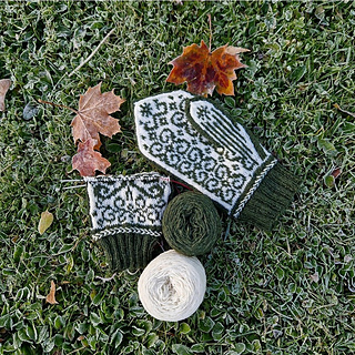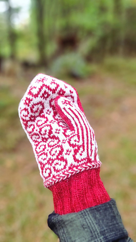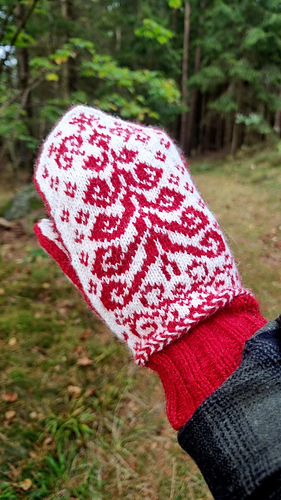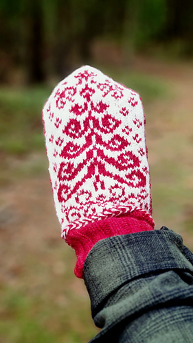 The mitten is knitted from the cuff and up with nice details as thumb gusset and a Latvian braid. If you want a slightly longer mitten you can choose to include the optional border to add to the length of the hand section.