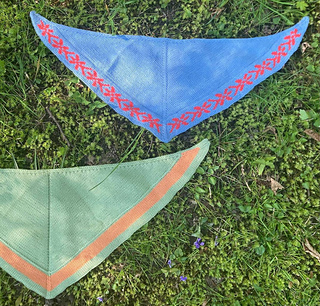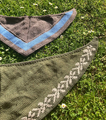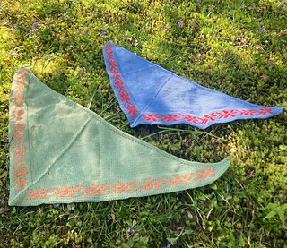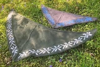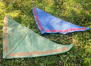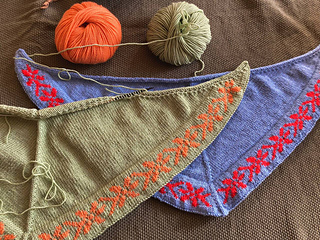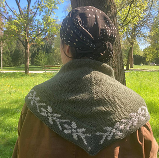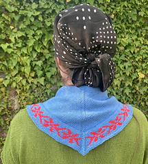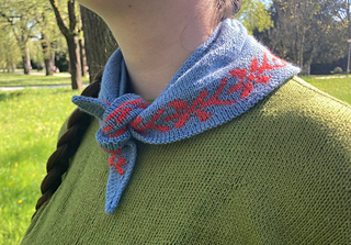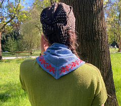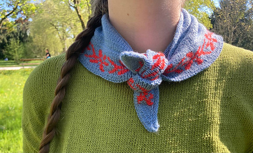 The scarf “Fina” is knitted in rows from the centre outwards in a triangular shape. At the edge, colourwork knitting creates a pattern with fine flowers. After the colouwork, a folded border is knitted and then knitting continues with decreases. This creates a two-layer fabric at the edge, one side with flowers and one with a stripe, which is then knitted together. This means that the scarf can be worn from both sides and the tension threads created by the colourwork do not get stuck in the clothing. Finally, an I-cord is knitted on the long side.