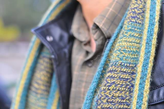 Combining intarsia and stranded color work with the technique of locked floats, the finished piece is soft, graphic, and almost reversible (with the back appearing almost woven).