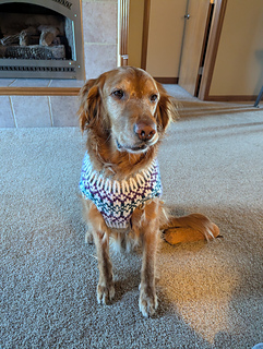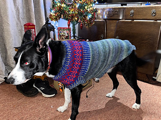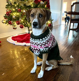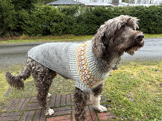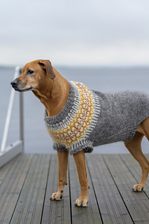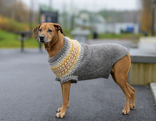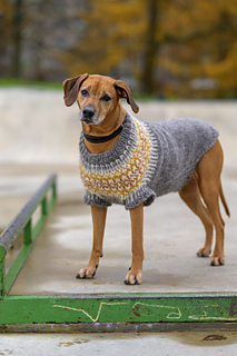 Fiona Dog Sweater is a warm and easy-to-wear winter sweater designed for large dogs. A similar pattern for smaller dogs can be found at: https://ravel.me/fiona-for-dogs
