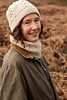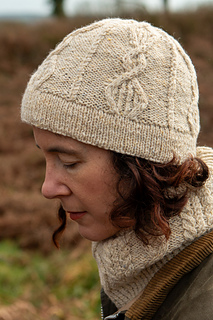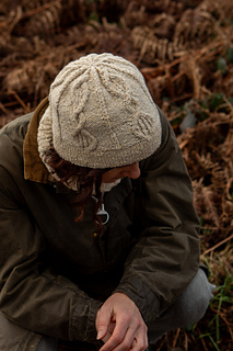 This hat features a few unusual details while also echoing a traditional Aran cable motif. It is worked in the round with a folded hem that gives a tidy, snug finish.