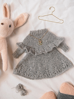 Construction: The dress is worked top-down in the round with raglan shaping. A ruffled hem section is worked at the mid-body. Stitches for the body and skirt are then picked up and worked separately.
