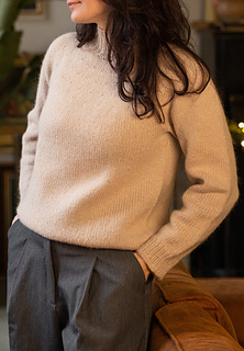 This sweater is knit seamlessly from the top down, starting with the neckline ribbing. German Short Rows are used to shape the back neck (optional). The yoke is formed with five rounds of increases, and then the body and sleeves are separated and knit in the round.