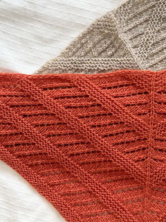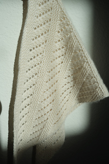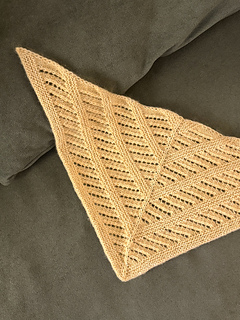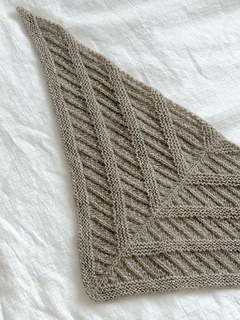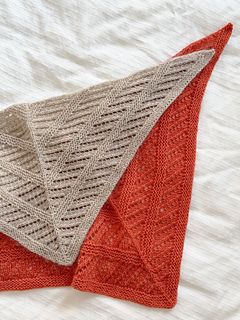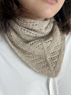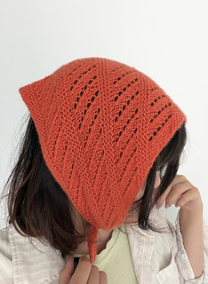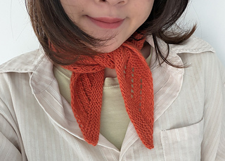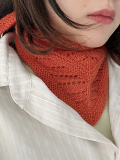 Fishbone Scarf is a triangular mini scarf featuring lace and garter stitch that is designed to create angled geometric lines. It could also be worn as a bandanna. The scarf is worked from top down with a start at the center. The triangle is shaped with increase. It can be knitted in luxurious cashmere for a soft, cozy accessory on a chilly early-spring day. Or, taking less than 50 grams of yarn, it could easily be a stash buster for your leftover yarn. This pattern is beginner-friendly and a great introduction to lace knitting for knitters who want to venture into lace.