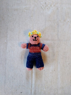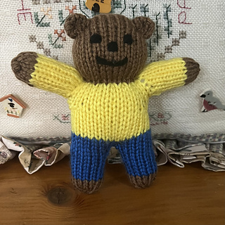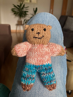 This bear is knit in the round from the top down. Sleeves are created by increasing at each of the arms and then placing stitches on waste yarn once they total 12 stitches. Then the body is knit in the round proceeding to the lower torso (or pants) which splits to form two legs. Held stitches are placed back on needles and knit in the round for arms and paws. Finishing includes stuffing, cinching legs and arms, and embroidering a face.