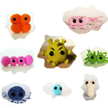 Some of the rod-shaped bacteria (bacilli) move with flagella, and some others cannot move. Those with flagella may come in twisted shapes. Here we have a bacillus (’Escherichia coli’, which lives in our gut and is usually a good friend, producing vitamin K for us, but sometimes goes bad), a spiral bacillus (’Helicobacter pylori’, which is the cause of stomach ulcers), and a comma-shaped bacillus (’Vibrio cholerae’, which causes cholera). No matter whether they are good or bad, all these giant amigurumi bacteria are cute, fast and so easy to make, and any microbiologist or biologist will love them!