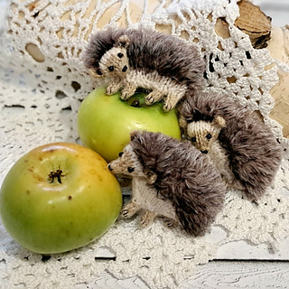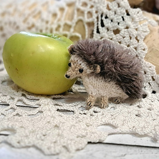 The design features a compact, slightly flat shape with a soft belly and a textured back, creating a cozy and realistic look. The pattern includes two construction options, allowing you to create either a sitting hedgehog or one standing on four legs.