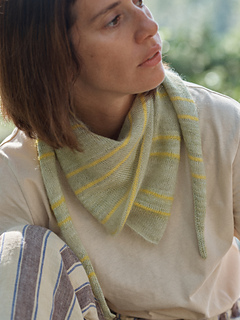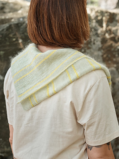 Flickflauder is a striped shawl made out of two shifted triangles that are folded on top of each other to create its dynamic shape. The main stripes are accentuated by a second, slightly offset layer of bright yellow stripes. Transparent stripes of mohair let the light shine through when folded. A captivating overlay of colours and textures creates a vibrant cheerful garment to spice up every outfit.