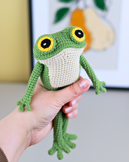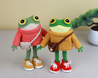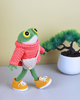 Meet Flip the Frog – a stylish, huggable amigurumi frog with his own sweater, sneakers, and a little bag!