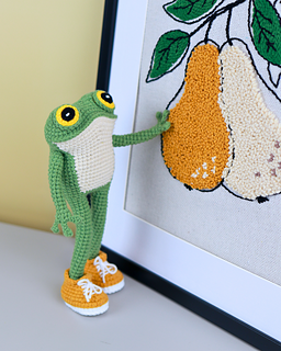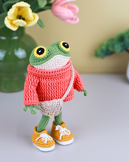 Materials needed: Sport weight yarn in frog, sweater, shoe, and bag colors, crochet hook (suggested 2.00-2.50 mm), fiberfill for stuffing, glue for eyes, button 6–7 mm for the bag, piece of cardboard measuring 4x8 cm for the sneaker soles, yarn needle