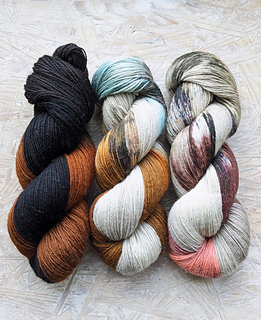 three skeins of Barker Wool BFL Fingering in three separate colorways designed for use with Assigned Pooling.