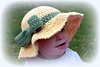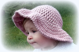 Fun floppy sun hat for babies. Pattern has 2 sizes 0-6 months and 6-12 months. Easy and works up quickly with less than 150 yds worsted weight yarn.