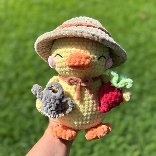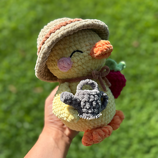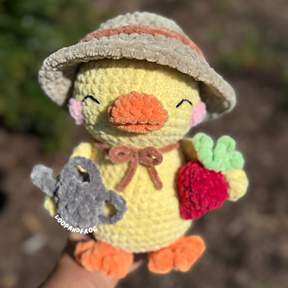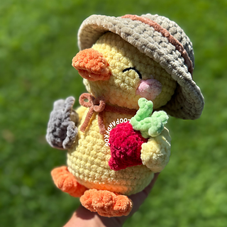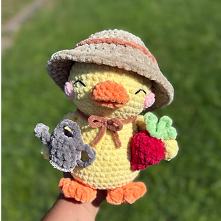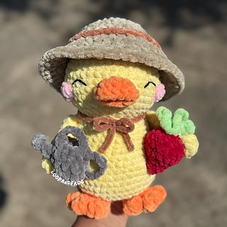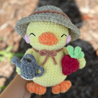 Bring some whimsy to your crochet queue with Flora the Duck– a charming amigurumi duck who loves gardening! She is complete with her floppy sunhat, tiny watering can, and freshly picked radish!