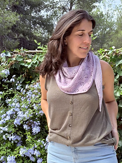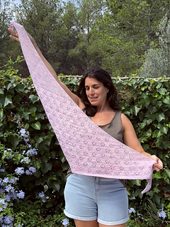 El pañuelo Floresta es un pañuelo triangular asimétrico que se trabaja de lado. Empezamos por la punta de la izquierda en punto de derecho y seguimos con la parte trabajada en un delicado y sencillo encaje.