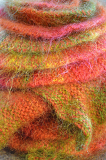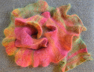 The pattern calls for two 25 gram balls (or one 50 gram ball) of Rowan Kidsilk Haze and one 50 gram skein of Malabrigo Lace Weight 100% Baby Merino yarn, double stranded, about 470 yards of each. I have worked this up in several combinations of variegated yarns for interesting effect.