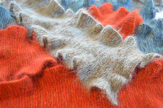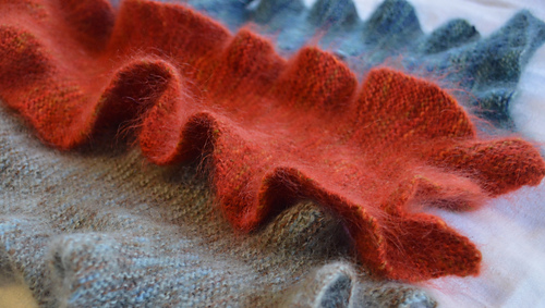 The graceful “Florrie” scarf is worked in garter stitch on small (size US 2-2.5 / 3.00 mm) needles and is elegant yet easy to knit. Simple short rows create the subtle ruffle along each edge, with increases at the ends creating a graceful flounce. Lace weight baby Merino wool and a blend of mohair and silk (double stranded throughout) create a scarf which is downy soft, strong, and light as a cloud.